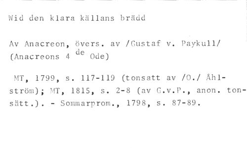 Wid den klara källans brädd //// Av Anacreon, övers. av /Gustaf v. Paykull/ (Anacreons 4 deOde) //// MT, 1799, s. 117-119 (tonsatt av /0./ Åhlström); MT, 1815, s. 2-8 (av G.v.P., anon. tonsätt.). - Sommarprom., 1798, s. 87-89.