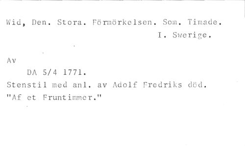 Wid, Den. Stora. Förmörkelsen. Som. Timade. //// I. Sverige. //// Av //// DA 5/4 1771. //// Stenstil med anl. av Adolf Fredriks död. "Af et Fruntimmer."