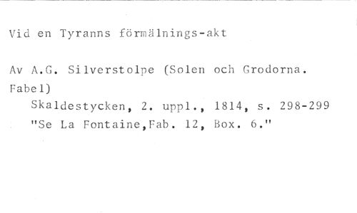 Vid en Tyranns förmälnings-akt //// Av A.G. Silverstolpe (Solen och Grodorna. Fabel) //// Skaldestycken, 2. uppl., 1814, s. 298-299 "Se La Fontaine,Fab. 12, Box. 6."