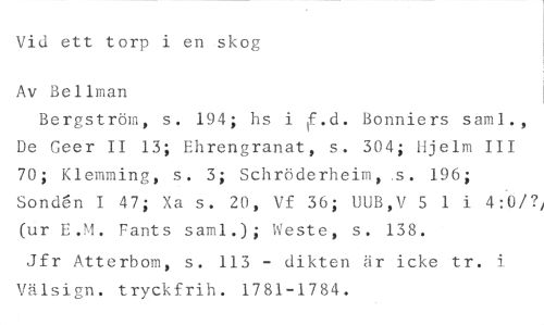 Vid ett torp i en skog //// Av Bellman //// Bergström, s. 194; hs i E.d. Bonniers saml., De Geer II 13; Ehrengranat, s. 304; Hjelm III //// 70; Klemming, s. 3; Schröderheim, 196; //// Sonden I 47; Xa s. 20, Vf 36; UUB,V 5 1 i 4:0/?) (ur E.M. Fants saml.); Weste, s. 138. //// Jfr Atterbom, s. 113 - dikten är icke tr. i Välsign. tryckfrih. 1781-1784.
