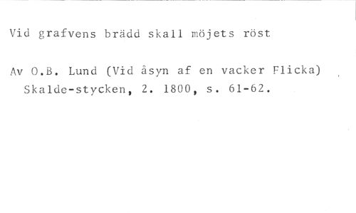 Vid grafvens brädd skall möjets röst //// Av O.B. Lund (Vid åsyn af en vacker Flicka) Skalde-stycken, 2. 1800, s. 61-62.