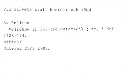 Vid Hafvets svall bestört och rädd //// Av Bellman //// Völschow VI 268 (feldaterad!) tr. i StP //// 1788:124. //// Dikten //// /Daterad 23/5 1788.