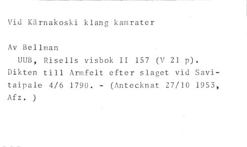 Vid Kärnakoski klang kamrater //// Av Bellman //// UUB, Risells visbok II 157 (V 21 p). Dikten till Armfelt efter slaget vid Savitaipale 4/6 1790. - (Antecknat 27/10 1953, Afz. )
