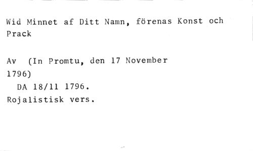 Wid Minnet af Ditt Namn, förenas Konst och Prack //// Av (In Promtu, den 17 November //// 1796) //// DA 18/11 1796. Rojalistisk vers.