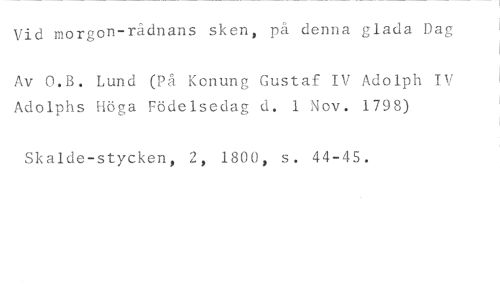 Vid morgon-rådnans sken, på denna glada Dag //// Av O.B. Lund (På Konung Gustaf IV Adolph IV Adolphs Höga Födelsedag d. 1 Nov. 1798) //// Skalde-stycken, 2, 1800, s. 44-45.