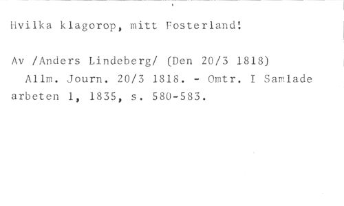Hvilka klagorop, mitt Fosterland! //// Av /Anders Lindeberg/ (Den 20/3 1818) //// Allm. Journ. 20/3 1818. - Omtr. I Samlade arbeten 1, 1835, s. 580-583.