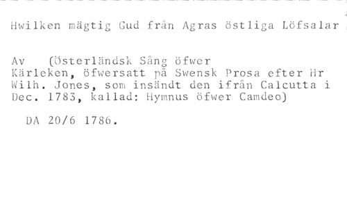 Hwilken mägtig Gud från Agras östliga Löfsalar //// Av (Österländsk Sång öfwer //// Kärleken, öfwersatt på Swensk Prosa efter Hr Wilh. Jones, som insändt den ifrån Calcutta i Dec. 1783, kallad: Hymnus öfwer Camdeo) //// DA 20/6 1786.