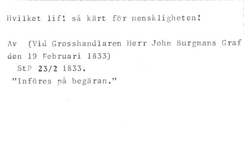 Hvilket så kärt för menskligheten! //// Av (Vid Grosshandlaren Herr John Burgenans Graf den 19 Februari 1833) //// StP 23/2 1833. //// "Införes på begäran."