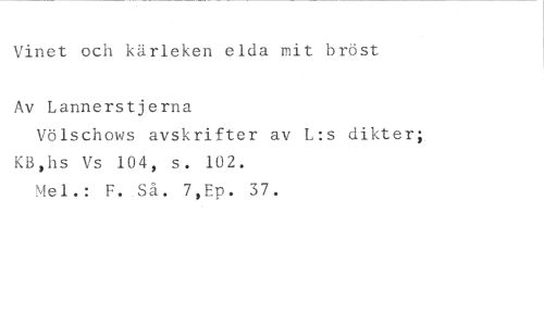 Vinet och kärleken elda mit bröst //// Av Lannerstjerna //// Völschows avskrifter av L:s dikter; KB,hs Vs 104, s. 102. //// diel.: F. Så. 7,Ep. 37.