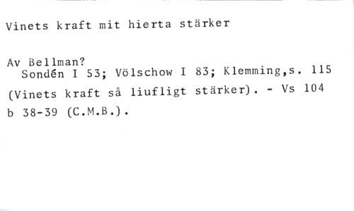 Vinets kraft mit hierta stärker //// Av Bellman? //// Sond6n I 53; Völschow I 83; Klemming,s. 115 //// (Vinets kraft så liufligt stärker). - Vs 104 b 38-39 (C.M.B.).