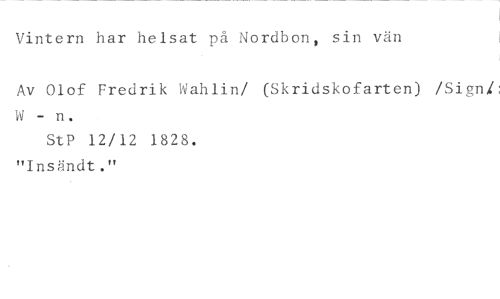 Vintern har helsat på Nordbon, sin vän //// Av Olof Fredrik Wahlin/ (Skridskofarten) /Sinn W - n. //// StP 12/12 1828. //// "Insändt."
