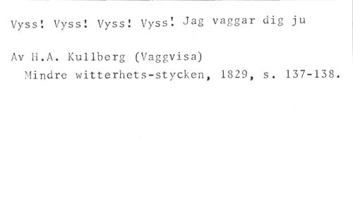 Vyss! Vyss! Vyss! Vyss: Jag vaggar dig ju //// Av H.A. Kullberg (Vaggvisa) //// Mindre witterhets-stycken, 1829, s. 137-138.