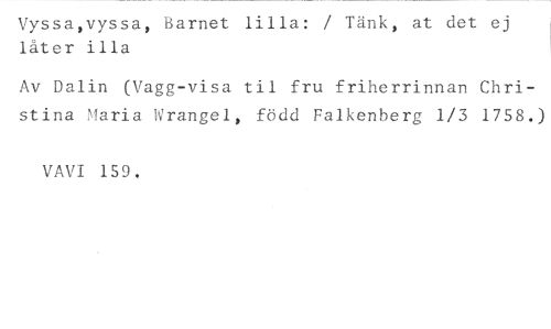Vyssa,vyssa, Barnet lilla: / Tänk, at det ej låter illa //// Av Dalin (Vagg-visa til fru friherrinnan Christina Maria Wrangel, född Falkenberg 1/3 1758.) //// VAVI 159.