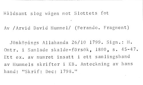 Wåldsamt slog wågen mot Slottets fot //// Av /Arvid David Hummel/ (Ferando. Fragment) //// Jönköpings Allahanda 26/10 1799. Sign.: H. Omtr. i Samlade skalde-försök, 1800, s. 45-47. Ett ex. av numret insatt i ett samlingsband av Hummels skrifter i KB. Anteckning av hans hand: "Skrif: Dec: 1798."