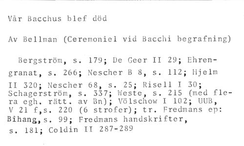 Vår Bacchus blef död //// Av Bellman (Ceremoniel vid Bacchi begrafning) //// Bergström, s. 179; De Geer II 29; Ehrengranat, s. 266; Nescher B 8, s. 112; Hjelm //// II 320; Nescher 68, s. 25; Risell I 30; Schagerström, s. 337; Weste, s. 215 (med flera egh. rätt. av Bn); Völschow I 102; UUB, V 21 f,s. 220 (6 strofer); tr. Fredmans ep: Bihang,s. 99; Fredmans handskrifter, //// s. 181; Coldin II 287-289