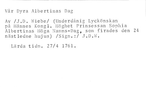 Vår Dyra Albertinas Dag //// Av /J.D. Wiebe/ (Underdånig Lyckönskan på Hännes Kongl. Höghet Prinsessan Sophia Albertinas Höga Namns-Dag, som firades den 24 nästledne hujus) /Sign.:/ J.D.W. //// Lärda tidn. 27/4 1761.