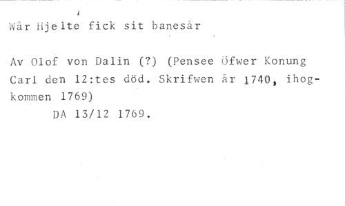 J //// Wår Hjelte fick sit banesår //// Av Olof von Dalin (?) (Pensee Öfwer Konung Carl den 12:tes död. Skrifwen år 1740, ihogkommen 1769) //// DA 13/12 1769.