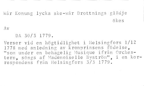 Wår Konung lycka ske-wår Drottnings glädje //// ökes //// Av //// DA 30/3 1779. //// Verser vid en högtidlighet i Helsingfors 1/12 1778 med anledning av kronprinsens födelse, "som under en behagelig Musique ifrån Orchestern, söngs af Mademoiselle Byström", i en korrespondens från Helsingfors 3/3 1779.