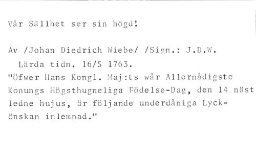 Vår Sällhet ser sin höge': //// Av /Johan Diedrich Wiebe/ /Sign.: J.D.W. Lärda tidn. 16/5 1763. //// "Öfwer Hans Kongl. Maj:ts wår Allernådigste Konungs Högsthugneliga Födelse-Dag, den 14 näst ledne hujus, är följande underdåniga Lyckönskan inlemnad."