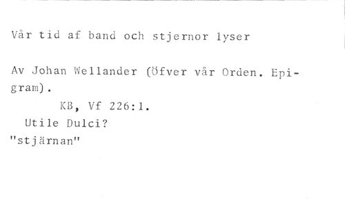 Vår tid af band och stjernor lyser //// Av Johan Wellander (Öfver vår Orden. Epi- //// gram). //// KB, Vf 226:1. //// Utile Dulci? //// "stjärnan"