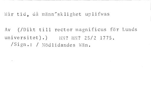 Wår tid, då männ'sklighet uplifwas //// Av (/Dikt till rector magnificus för Lunds //// universitet).) HN? HN? 25/2 1775. //// /Sign.: / Nödlidandes Wän.