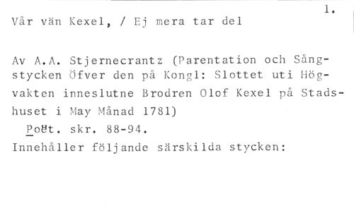 Vår vän Kexel, / Ej mera tar del //// Av A.A. Stjernecrantz (Parentation och Sångstycken Öfver den på Kongl: Slottet uti Hög- //// vakten inneslutne Brodren Olof Kexel på Stadshuset i May Månad 1781) //// Poet. skr. 88-94. //// Innehåller följande särskilda stycken: