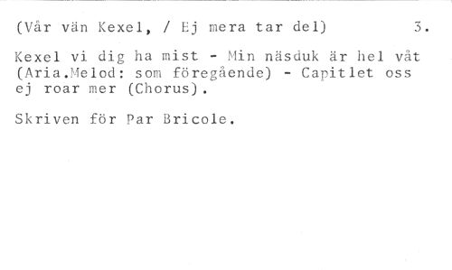 (Vår vän Kexel, / Ej mera tar del) 3. //// Kexel vi dig ha mist - Min näsduk är hel våt (Aria.Melod: som föregående) - Capitlet oss ej roar mer (Chorus). //// Skriven för Par Bricole.