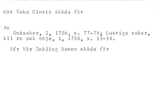 Wår Änka Cloris skåda får //// Av //// Småsaker, 2, 1756, s. 77-79; Lustiga saker, til ro och nöje, 1, 1759, s. 13-14. //// Jfr Vår Änkling Damon skåda får