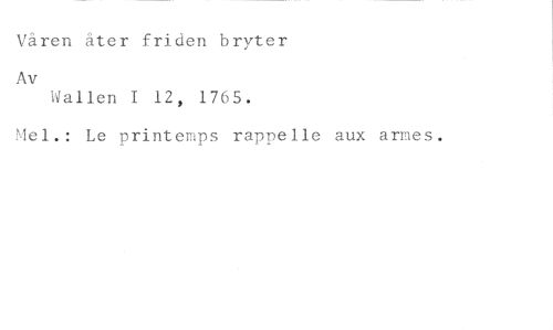 Våren åter friden bryter //// Av //// Wallen I 12, 1765. //// Mel.: Le printemps rappelle aux armes.