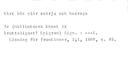 Vårt kön plär svärja och bedraga //// Av (Hvilketdera könet är //// brottsligast? Epigram) Sign. : ---K. Läsning för fruntimmer, 1;1, 1800, s. 85.