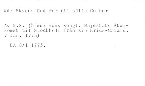 Wår Skydds-Gud for til sälla Göther //// Av N.S. (Öfwer Hans Kongl. Majestäts Återkomst til Stockholm från sin Erics-Gata d. 7 Jan. 1773) //// DA 8/1 1773.