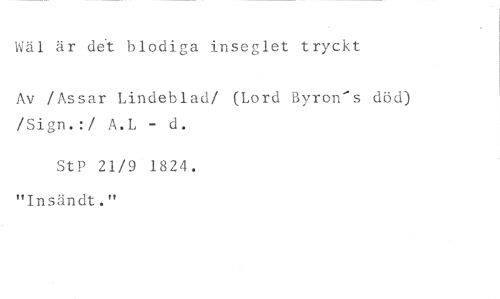Wäl är det blodiga inseglet tryckt //// Av /Assar Lindeblad/ (Lord Byron's död) /Sign.:/ A.L - d. //// StP 21/9 1824. "Insänds."