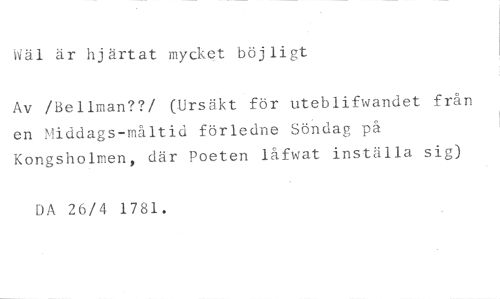 Wäl är hjärtat mycket böjligt //// Av /Bellman??/ (Ursäkt för uteblifwandet från en Middags-måltid förledne Söndag på Kongsholmen, där Poeten låfwat inställa sig) //// DA 26/4 1781.