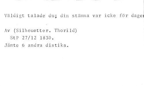 Väldigt talade du; din stämma var icke för dagå //// Av (Silhouetter. Thorild) StP 27/12 1830. //// Jämte 6 andra distika.