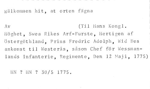 wälkommen hit, at orten fägna //// Av (Til Hans Kongi. //// Höghet, Swea Rikes Arf-Furste, Hertigen af Östergöthland, Prins Fredric Adolph, Wid Des ankomst til Westerås, såsom Chef för Wessmanlands Infanterie, Regimente, Den 12 Maji, 1775) //// HN ? H ? 30/5 1775.