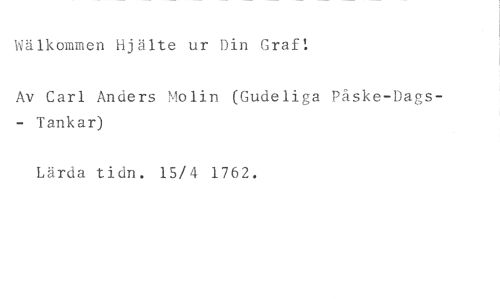 Wälkommen Hjälte ur Din Graf: //// Av Carl Anders Molin (Gudeliga Påske-Dags- Tankar) //// Lärda tidn. 15/4 1762.