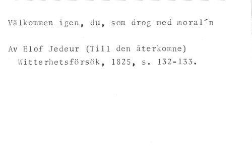 Välkommen igen, du, som drog med moral'n //// Av Elof Jedeur (Till den återkomne) Witterhetsförsök, 1825, s. 132-133.