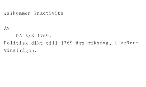 Wälkomm n inactivite //// Av //// DA 5/8 1769. //// Politisk dikt till 1769 års riksdag, i brännvinsfrågan.