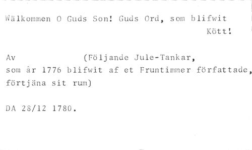 välkommen 0 Guds Son! Guds Ord, som blifwit //// Kött! //// Av (Följande Alle-Tankar, //// som år 1776 blifwit af et Fruntimmer författade, förtjäna sit rum) //// DA 28/12 1780.