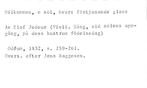 Välkommen, o sol, byars förtjusande glans //// Av Elof Jedeur (Vivli. Sång, vid solens uppgång, på dess hustrus födelsedag) //// Od6um, 1832, s. 259-261. Övers. efter Jens Baggesen.