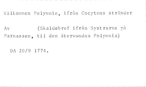Wälkommen Polymnie, ifrån Cocytens stränder //// Av (Skaldebref ifrån Systrarne på //// Parnassen, til den återwundna Polymnia) //// DA 20/9 1774.