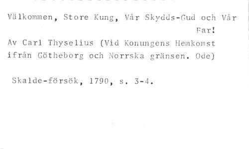 Välkommen, Store Kung, Vår Skydds-Gud och Vår //// Far! //// Av Carl Thyselius (Vid Konungens Hemkomst ifrån Götheborg och Norrska gränsen. Ode) //// Skalde-försök, 1790, s. 3-4.