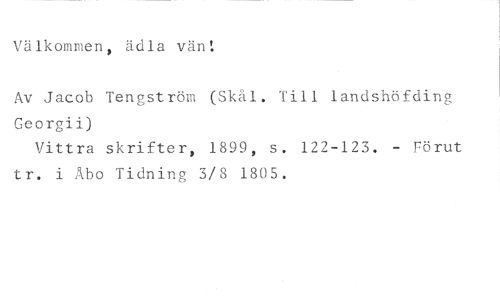 Välkommen, ädla vän: //// Av Jacob Tengström (Skål. Till landshöfding Georgii) //// Vittra skrifter, 1899, s. 122-123. - Förut tr. i Åbo Tidning 3/8 1805.