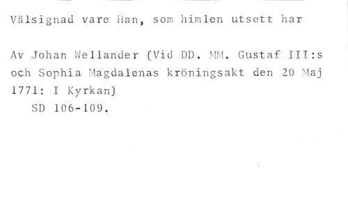 Välsignad vare Han, som himlen utsett har //// Av Johan Wellander (Vid DD. MM. Gustaf III:s och Sophia Magdalenas kröningsakt den 20 Maj 1771: I Kyrkan) //// SD 106-109.