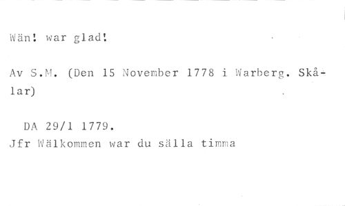 Wän: war glad! //// Av S.M. (Den 15 November 1778 i Warberg. Skålar) //// DA 29/1 1779. //// Jfr ovälkommen war du sälla timma