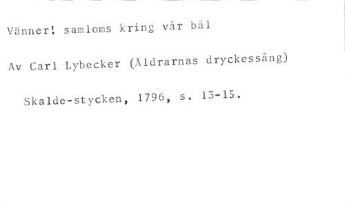 Vänner! samloms kring vår bål //// Av Carl Lybecker (Åldrarnas dryckessäng) //// Skalde-stycken, 1796, s. 13-15.