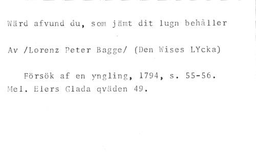 Wärd afvund du, som jämt dit lugn behåller Av /Lorenz Peter Bagge/ (Den Wises LYcka) //// Försök af en yngling, 1794, s. 55-56. Elers Glada qväden 49.