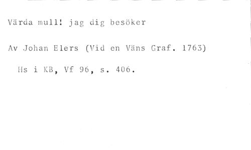 Värda mull! jag dig besöker //// Av Johan Elers (Vid en Väns Graf. 1763) Hs i KB, Vf 96, s. 406.