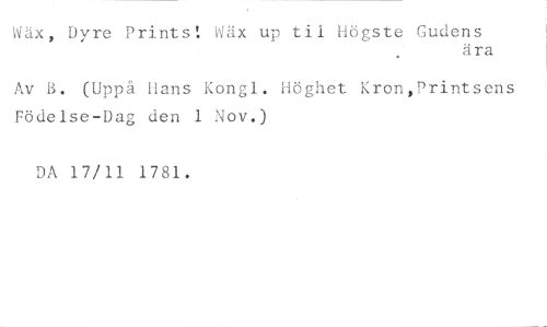 Wäx, Dyre Prints! Wäx up til Högste Gudens //// ära //// Av B. (Uppå Hans Kongl. Höghet Kron,Printsens Födelse-Dag den 1 Nov.) //// DA 17/11 1781.
