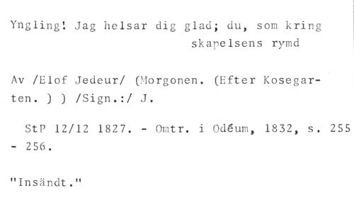 Yngling: Jag helsar dig glad; du, som kring //// skapelsens rymd //// Av /Elof Jedeur/ (Morgonen. (Efter Kosegar. ten. ) ) /Sign.:/ J. //// StP 12/12 1827. - Omtr. i Od6um, 1832, s. 255 - 256. //// "Insändt."